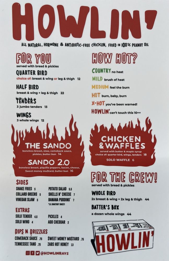 “ Had howlin rays for the first time today had to check it out see what all the hype was about and was very pleased! The chicken sando was much better than most hot chicken places. Very juicy and full of flavor. However my favorite part of the experience was the service and employees. They all make you feel very welcomed and are built like a family. Special shout out to Makua who works there he recommended the place to me and am glad he did. 5 stars baby ”